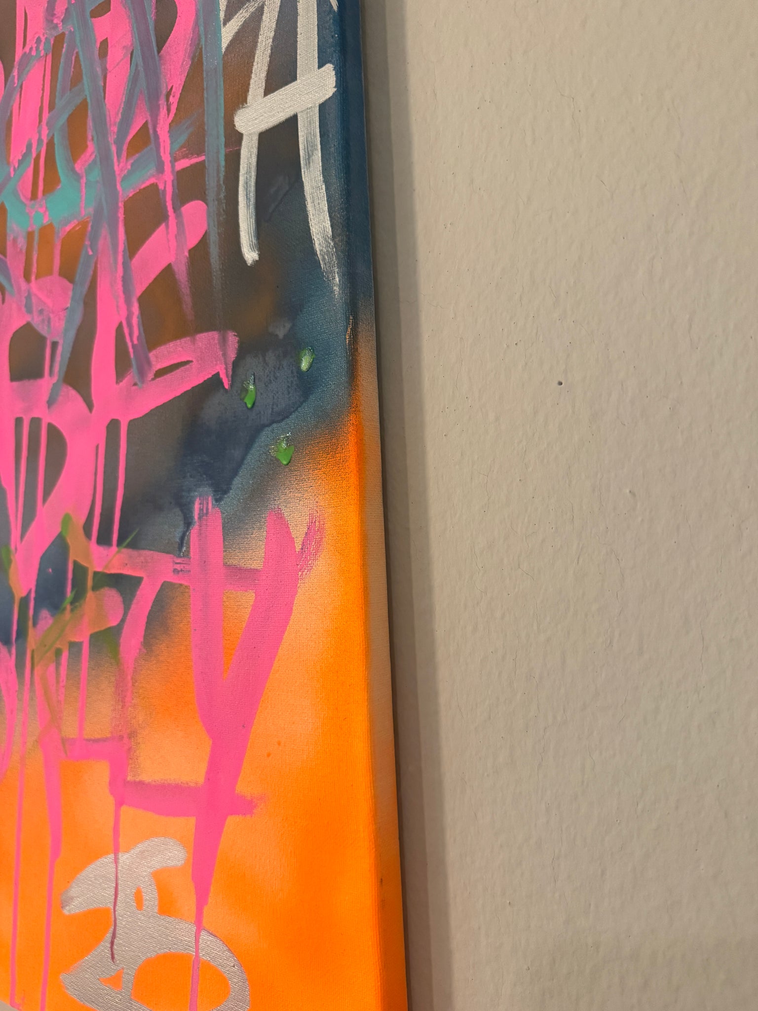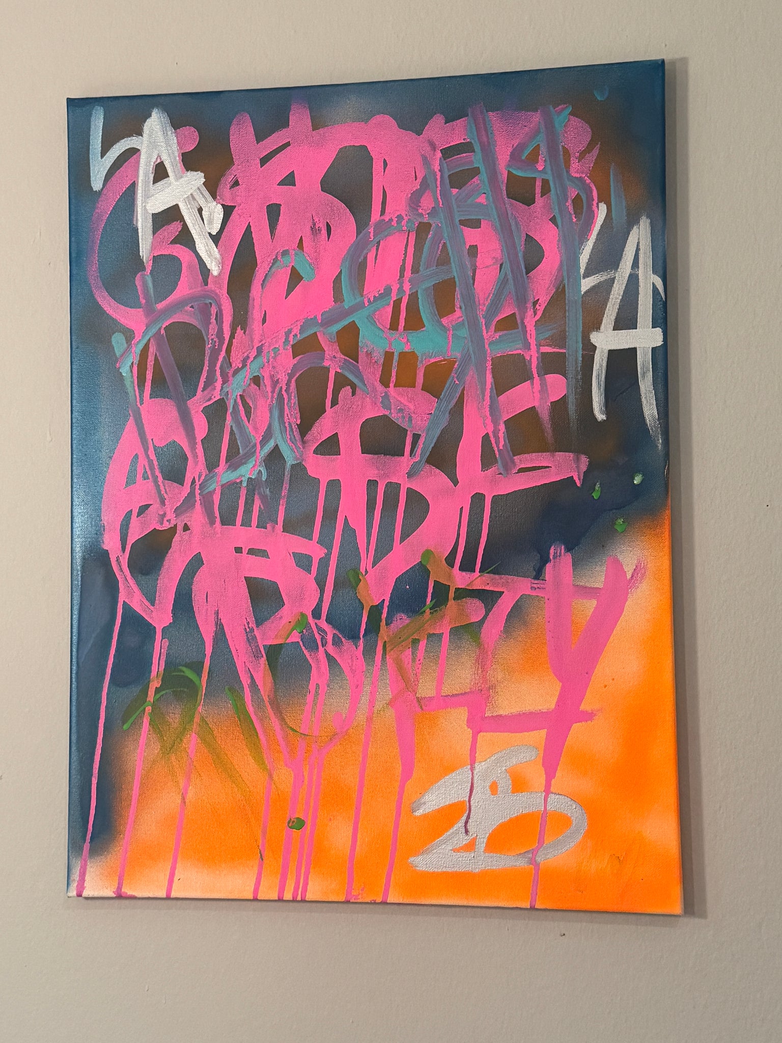 Saint of Angels captures the electrifying spirit of Los Angeles — the divine pulse of the “City of Angels.” Layers of vibrant graffiti strokes, radiant pinks, and sunset gradients evoke the rhythm of early mornings and unforgettable dusks over the city. The piece channels the urban saint’s path — a mix of hustle, holiness, and heat — symbolizing the beauty, chaos, and relentless energy that define LA’s majestic vibe.