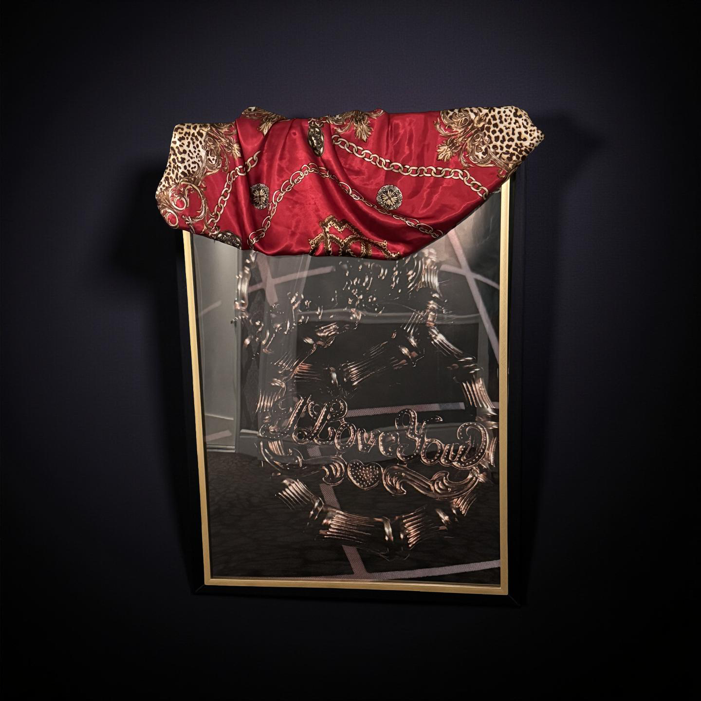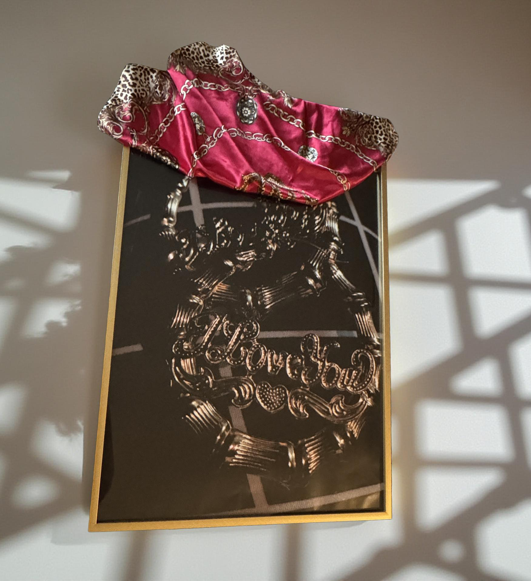 This artwork captures the essence of love and romance through the heartbeat of hip-hop culture — where style becomes language and affection is worn like jewelry. The “I Love You” bamboo earrings symbolize devotion, a gift that speaks without words. Draped over the frame, the silk scarf represents passion, protection, and pride — something instantly recognizable in the culture, whether she’s preserving her hair before bed or stepping out into the world with confidence and style.
