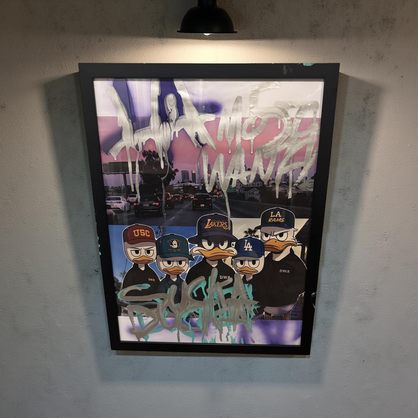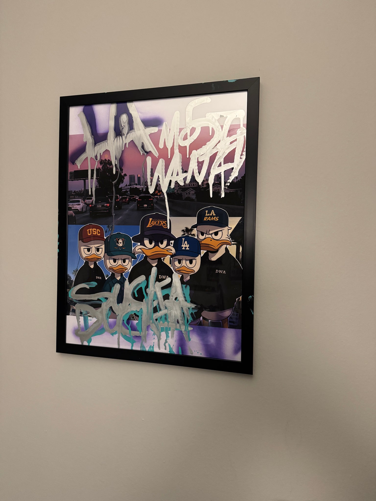 “Sucka Ducka” is a powerful fusion of street art, nostalgia, and Los Angeles attitude. Inspired by the legacy of N.W.A. and the cartoon energy of DuckTales and Darkwing Duck, this piece features Huey, Dewey, Louie, and Darkwing Duck dressed in LA team gear — USC, Lakers, Dodgers, and Rams — standing together like a west-coast rap crew.